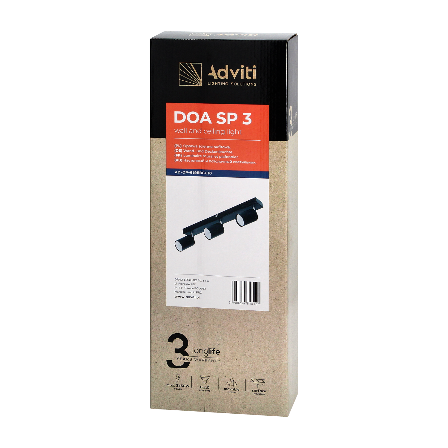 DOA SP 3 is a movable light fitting that will be perfect for any places where there is a need to direct the light in a specific direction to illuminate or emphasize elements of the decor and create an interesting visual effect. Thanks to its simple and minimalistic design, this wall and ceiling luminaire fits both - residential and commercial spaces, decorated in a traditional or modern style. The product is suitable for light sources with a GU10 base (not included) of 3 x 7W maximum rated power and it is made of steel. The direction of light beam can be adjusted thanks to the movable body of the luminaire. Suitable for both - wall and ceiling mounting. The luminaire is available in white or black.