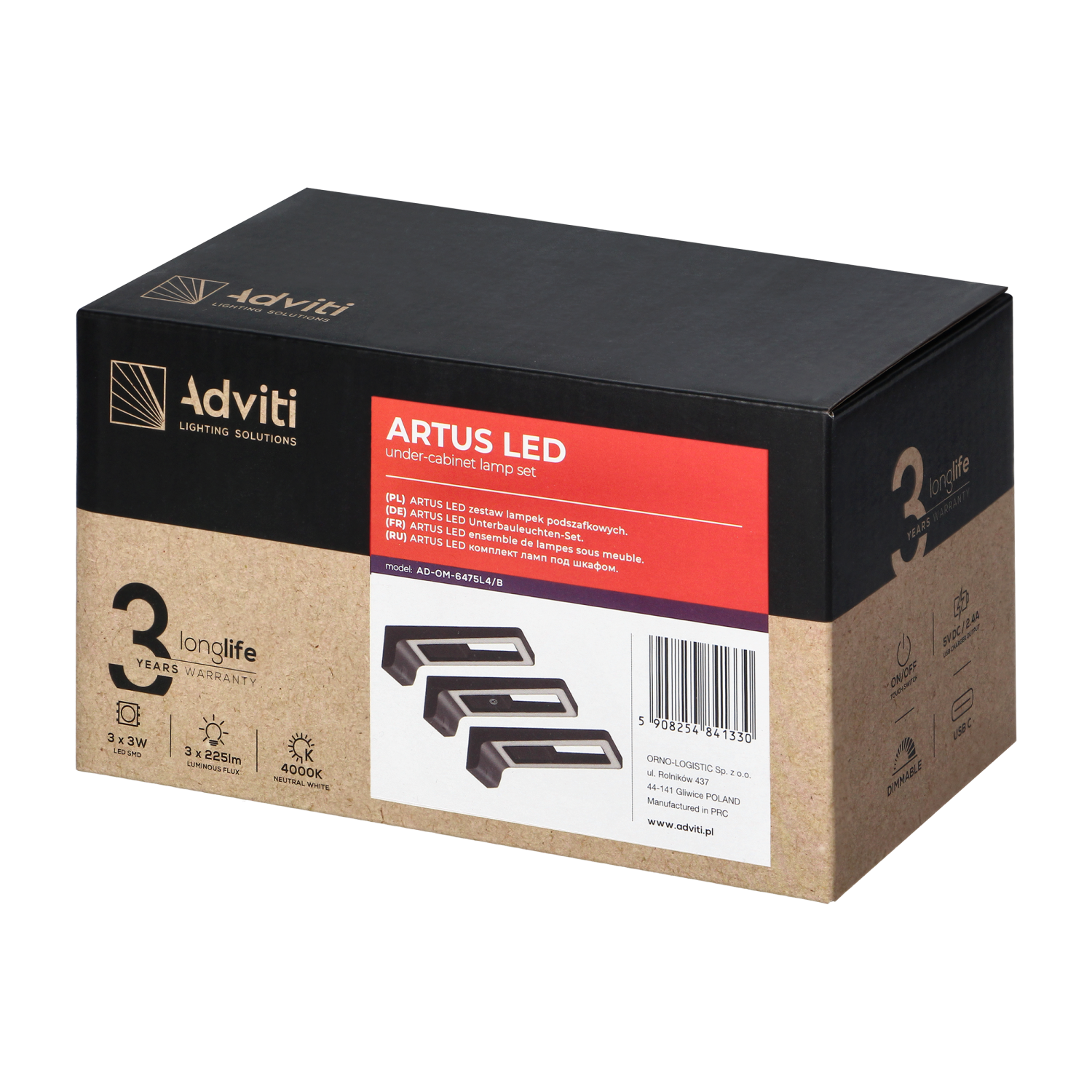 Zestaw 3 lampek podszafkowych ARTUS LED w kolorze czarnym, o mocy 3W i strumieniu świetlnym 225lm każda. Emitują one światło o przyjemnej, neutralnej barwie 4000K. Jedna z trzech lampek posiada włącznik dotykowy, który steruje pracą całego zestawu oraz reguluje jasność światła poprzez przytrzymanie włącznika dłonią. Dodatkowo lampka posiada wbudowany port USB C (5V 2,4A), dzięki któremu można łatwo ładować inne urządzenia elektryczne, takie jak telefon czy tablet.